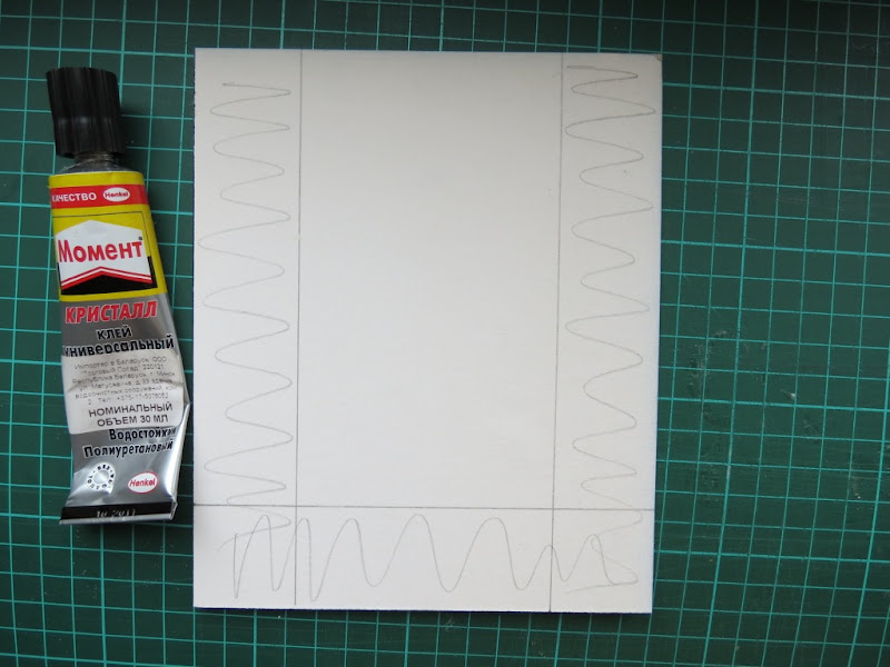 и наносим клей по периметру рамки, кроме верхней стороны. как нарисовано на картоне. предусматриваем тот момент, что клей наносим так, чтобы наша фотография не "проваливалась" и хорошо влазила