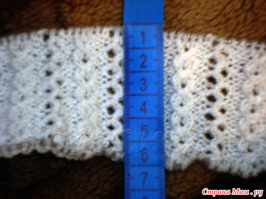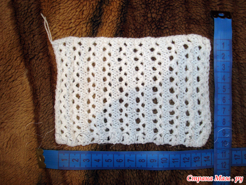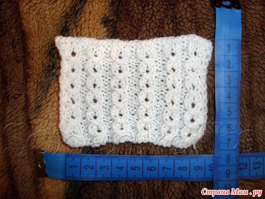Узор "ажурные дорожки". Именно по нему в описании расчитывается плотность вязания. У меня она такова: 10см Х 10см = 30.8 пет. Х 44.4 ряд.