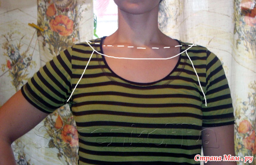 Для того, чтобы мне было проще представить модель на себе, я ее прорисовала на фото. Белыми линиями очертила горловину, которую я хочу вывязать и линии реглана, где они будут проходить.
