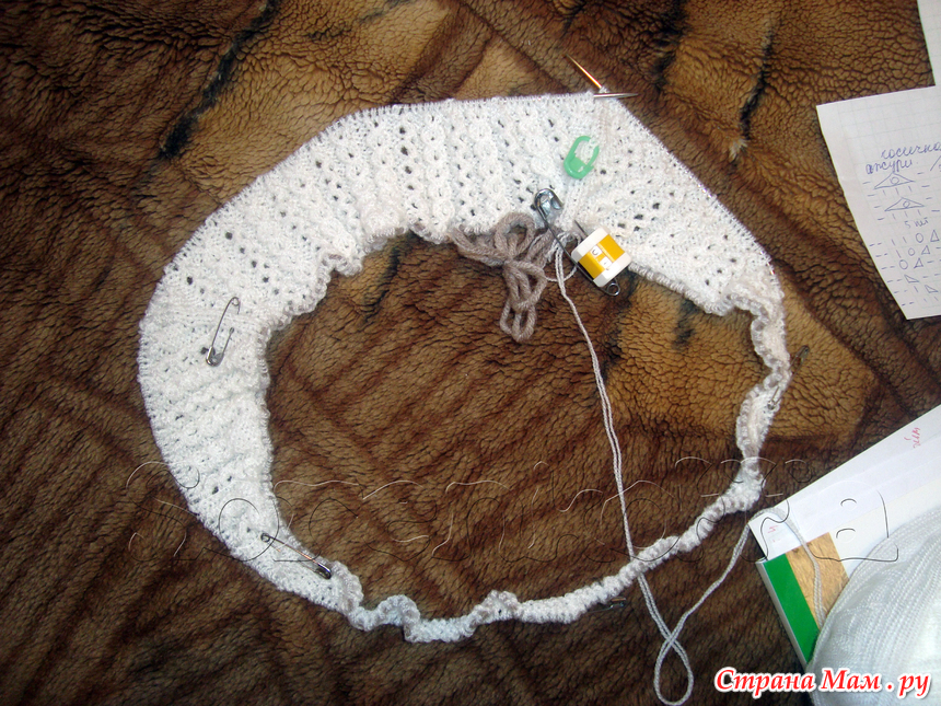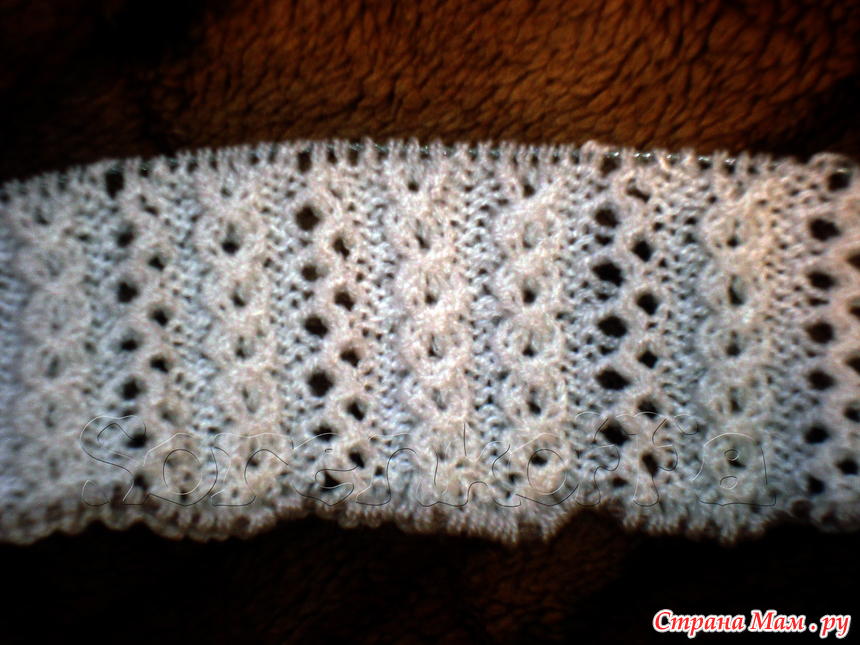 Вывязывать ажурные узоры начинала только тогда, когда количество включенных петель позволяло поместить раппорт требуемого ажура, а в случае с "ажурными косичками" еще учитывала и рядность, то есть каждая "ажурная косичка" начиналась у меня с трех лицевых.