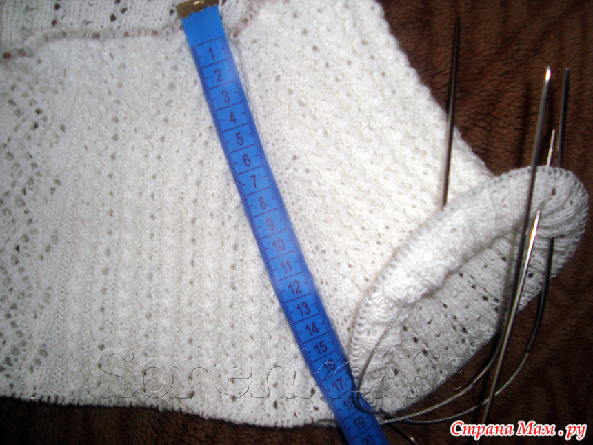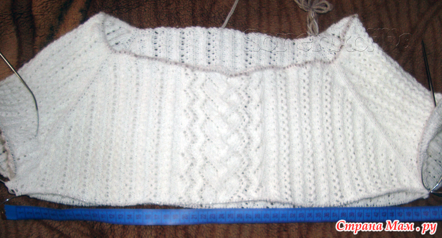 Итак, продолжаю вязать. После того, как кокетка связана, а петли рукавов сброшены на нить, вяжу вниз корпус изделия. По моим расчетам это 168 рядов. 20 из них буду вязать резинкой внизу, остальные - по рисунку. Так как разница у меня в объеме груди и объеме бедер приличная, решила расширить немножко низ изделия. Долго думала, как это будет лучше сделать, и пришла к выводу, что лучше все-таки добавить равномерно эти 20 петель разницы. Можно было просто сменить номер спиц на 0.5 (0.25)-номера больше. Петли добавляла не постепенно, а в одном ряду, равномерно распределяя их между ажурами. Получилось вот так:
