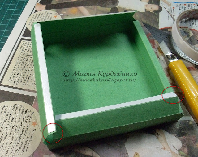 Следующий этап - склеивание коробочек. Я это делала на двусторонний скотч, предварительно налепив его на всю эту гору заготовок))) Склеивала в таком порядке - сначала вклеила внутрь "уши", следя, чтобы углы получались ровными и красивыми. А, перед склейкой ещё подрезала немного наискосок все части, которые будут подворачиваться внутрь (на фото кружочком обведено) и уши тоже! - чтобы легче все вкладывалось друг в друга. Потом подвернула бортики с прямым срезом