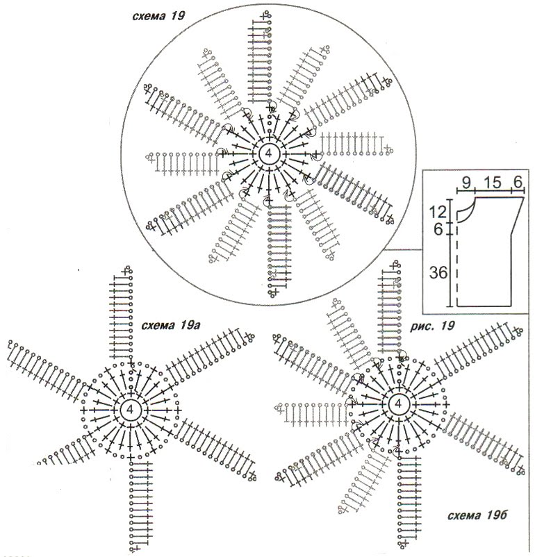 Изделие собрано из отдельных мотивов - ромашек (схема 19), принцип выполнения которых заключатеся в том, что лепестки вяжутся на основании цепочек ВП, идущих от плотной серединки, причем сначала выполняются 6 длинных лепестков нижнего яруса (схема 19 а), а затем, в следующем ряду, вяжутся 12 коротких лепестков верхнего яруса (схема 19 б). Объемность и выразительность цветку придает серединка , выполненная из буклироанной пряжи.