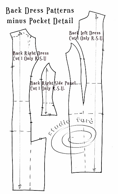 Задняя выкройки включают заднюю левую платье, как один шаблон кусок отличая принцесса линии дротик. Задняя правая сторона платье с карманом функции (продолжение спереди) и боковые принцесса линия панель кузова, которая заканчивается, как клапан кармана.