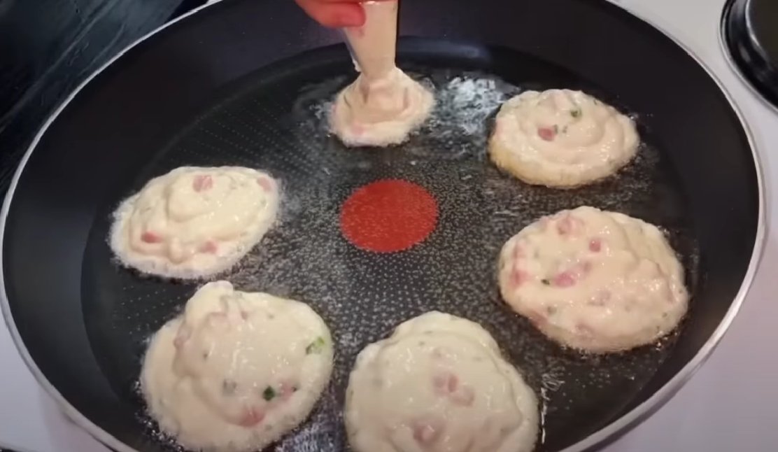 Тесто выдавливаем на разогретую сковороду при помощи кондитерского мешка (или просто выкладываем ложкой). Растительного масла не жалеем.