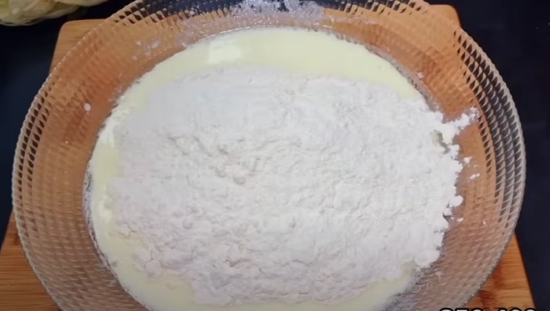 Добавляем соль, соду, сахар. Вливаем растительное масло и всыпаем муку. Замешиваем тесто.