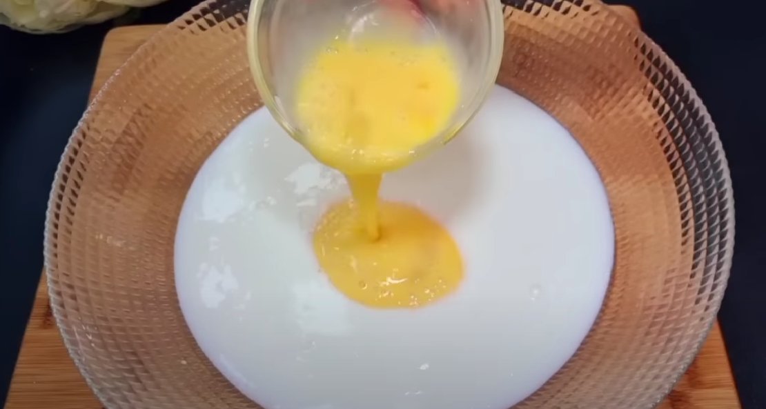Кефир разогреем в микроволновке, чтобы он был практически горячим. Яйца взболтаем и вольем в кефир, перемешаем.