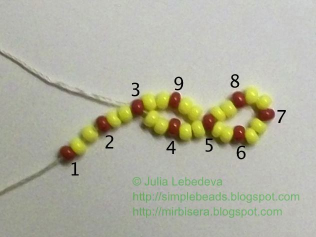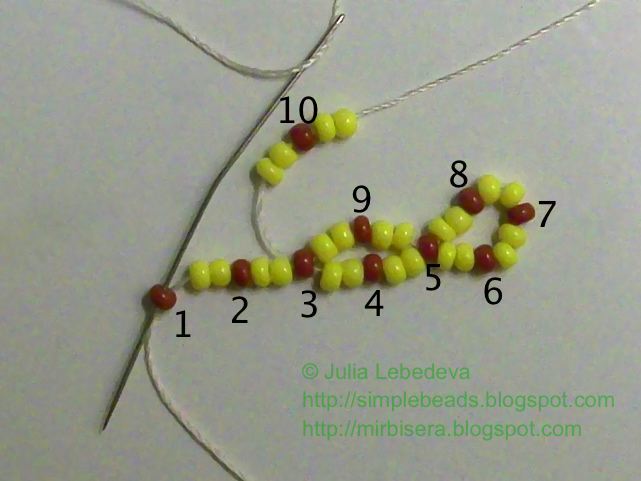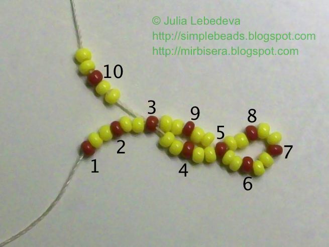 Снова набираем на иглу 2 жёлтые, 1 коричневую и ещё 2 жёлтые бисеринки. Коричневую бисеринку опять мысленно нумеруем - это будет коричневая бисеринка номер 10.
