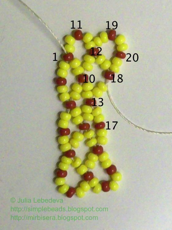 Следующий отрезок будет лежать на краю полотна, поэтому для него набираем бисеринки в следующем порядке: 2 жёлтые, 1 коричневая, 2 жёлтые, 1 коричневая и ещё 2 жёлтые. Коричневые бисеринки получаются с номерами 19 и 20. Приплетаем этот отрезок к полотну через бисеринку номер 18.