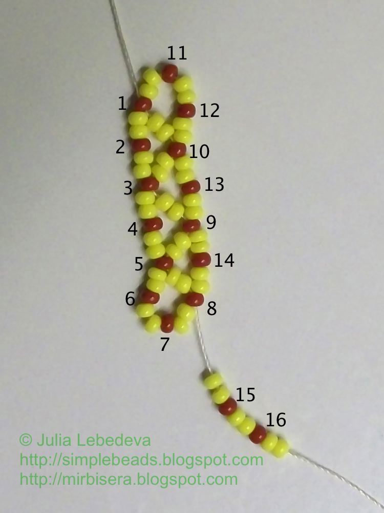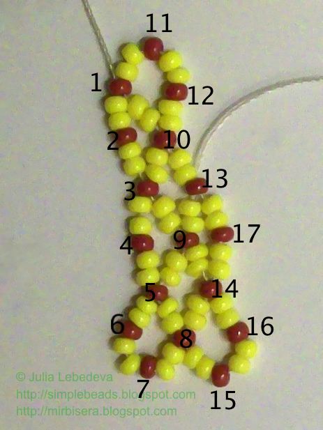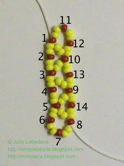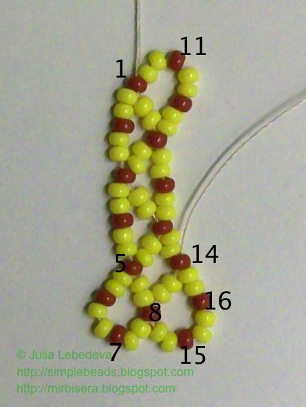 Набираем на иглу бисеринки в следующем порядке: 2 жёлтые, 1 коричневая, 2 жёлтые, 1 коричневая и ещё 2 жёлтые. Продолжаем нумеровать коричневые бисеринки - они будут номера 15 и 16.