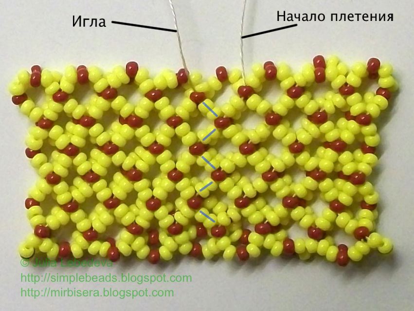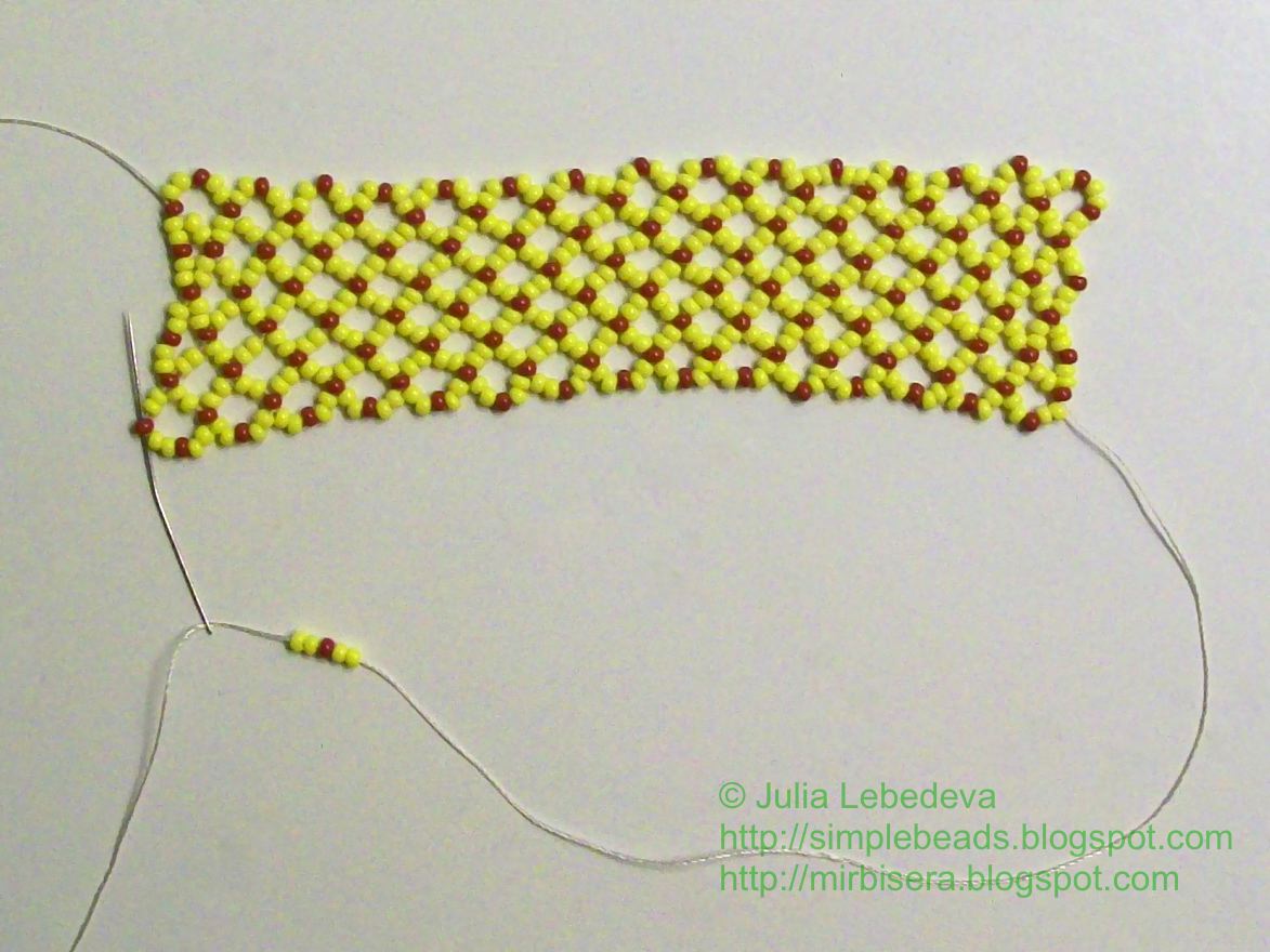 Схема плетения сетчатого полотна из бисера следующая:
