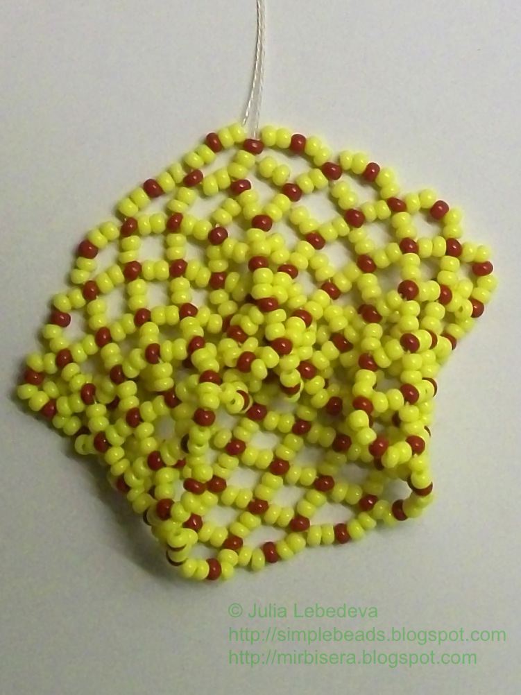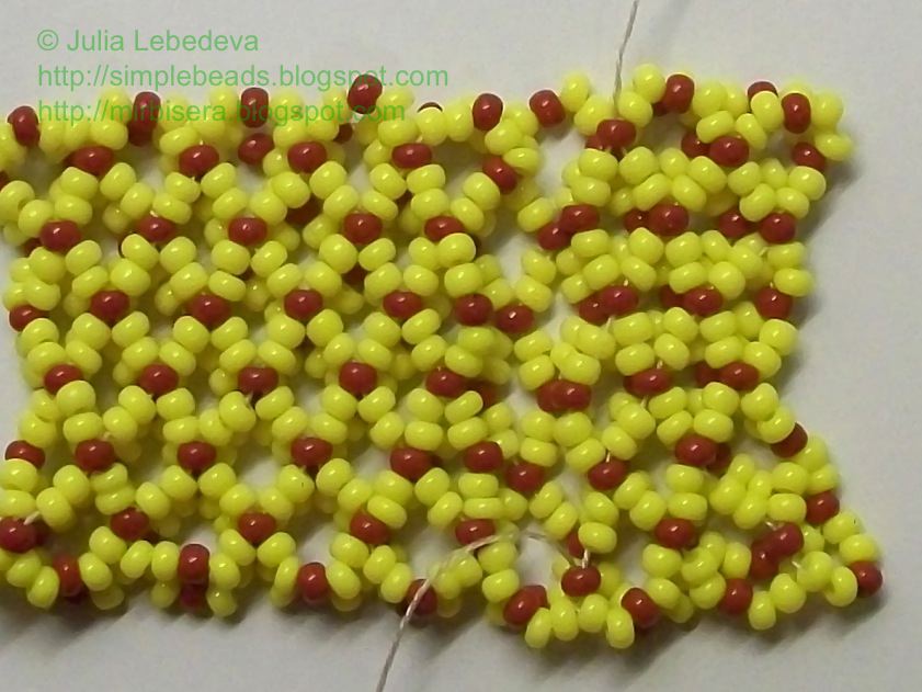 Продолжаем плести сетчатое полотно, добавляя бисеринки отрезками аналогичным образом. Все отрезки, лежащие в середине полотна, состоят из двух жёлтых, одной коричневой и двух жёлтых бисеринок. Для отрезков, образующих край полотна, набираем бисеринки в следующем порядке: 2 жёлтые, 1 коричневая, 2 жёлтые, 1 коричневая и ещё 2 жёлтые.