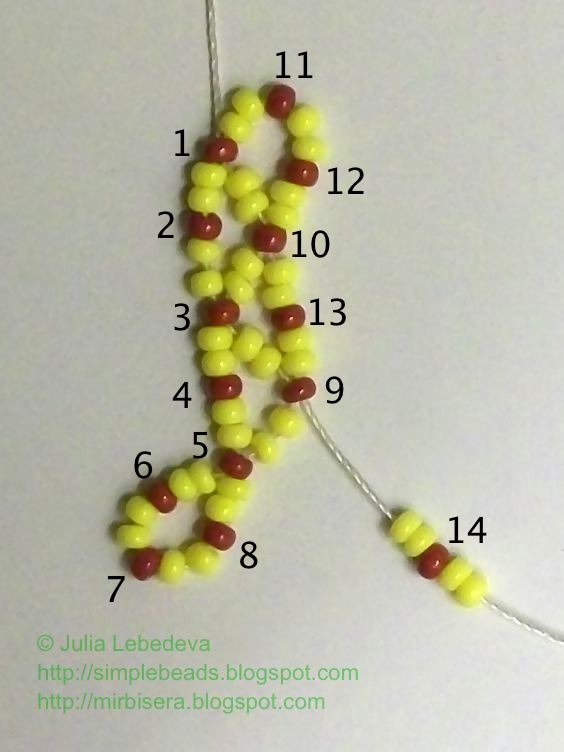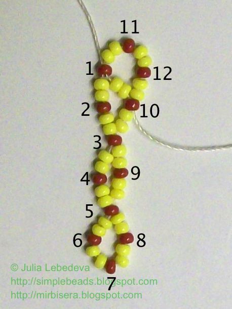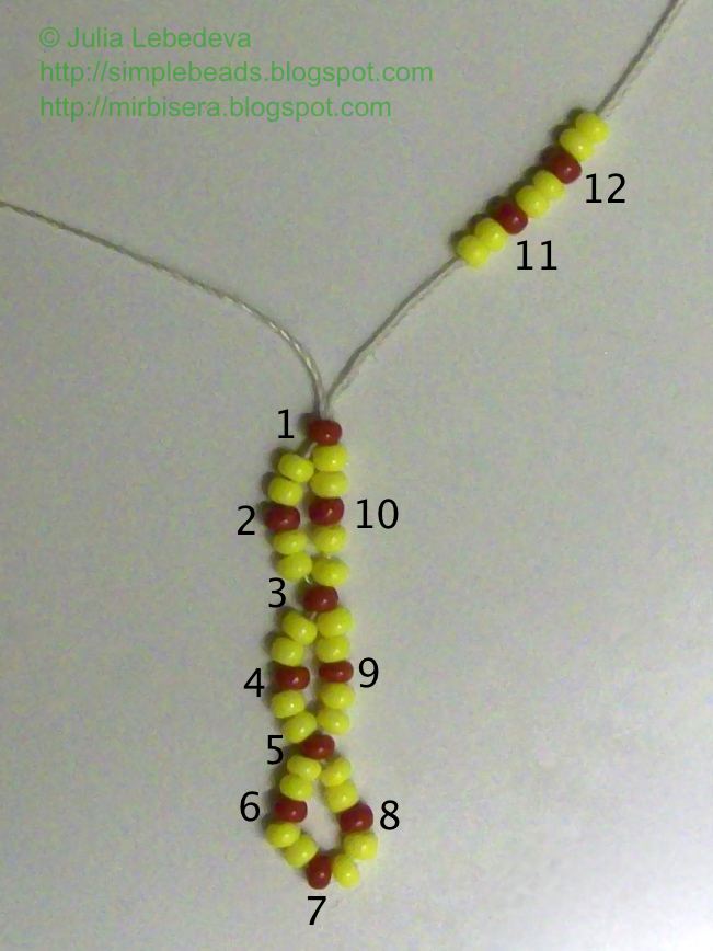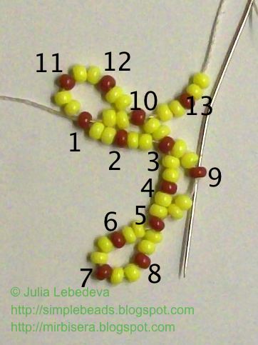 Набираем на иглу бисеринки в следующем порядке: 2 жёлтые, 1 коричневая, 2 жёлтые, 1 коричневая и ещё 2 жёлтые. Продолжаем нумеровать коричневые бисеринки - они будут номер 11 и номер 12.