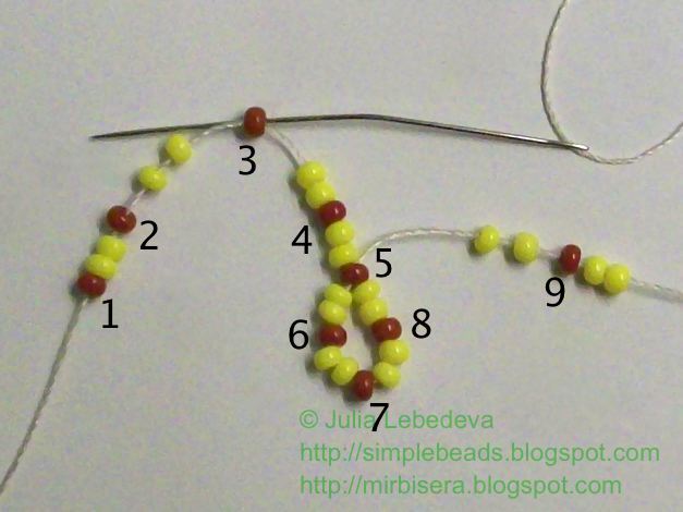 Далее набираем на иглу 2 жёлтые, 1 коричневую и ещё 2 жёлтые бисеринки. Коричневую бисеринку снова мысленно нумеруем, продолжая последовательность - это будет коричневая бисеринка номер 9.