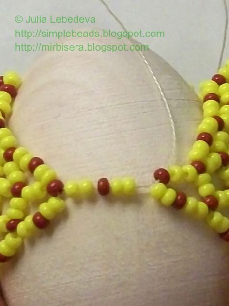 После того, как мы сшили середину полотна, нам осталось добавить последний соединительный отрезок. Набираем на нить две жёлтые, одну коричневую и ещё две жёлтые бисеринки и пропускаем иглу через коричневую бисеринку номер 1. Последний отрезок лёг на край полотна, а оба конца нити сейчас выходят в разные стороны из бисеринки номер 1.