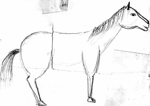 Высылаю вам свой рисунок. Помогите, пожалуйста, нарисовать нормальную лошадь, я столько времени убил, а всё равно получается это уёбище с человечьими ногами. Погибает ведь нормальный рисунок!