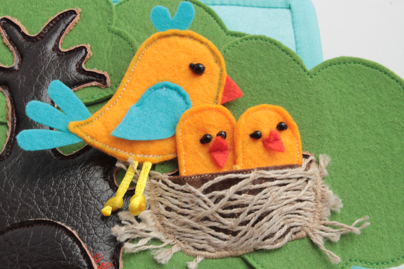 Такой вот дуб получился, ствол из иск. кожи. Сзади карман, туда прячутся персонажи из сказки. В дупле живет сова,  в норке мышка. Гнездо на ветке с птенцами и их мамой. Идею с такими закрывающимися дверками, подсмотрелау Тани опять))) У нее такой улей есть)))