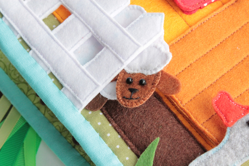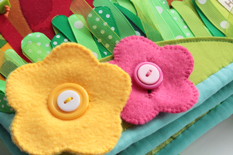 Задняя обложка, в бабке коробке на этот раз пищалка вшита + карман на молнии. Травка из репсовой ленты вперемешку с лентой из органзы, за травкой прячутся три маленькие бабки коробки на шнуре. + Два цветочка на пуговках добавила (понятия маленький большой))) Для тактильности дополнительной на усиках маленькие пуговички и бусинки-глазки...)