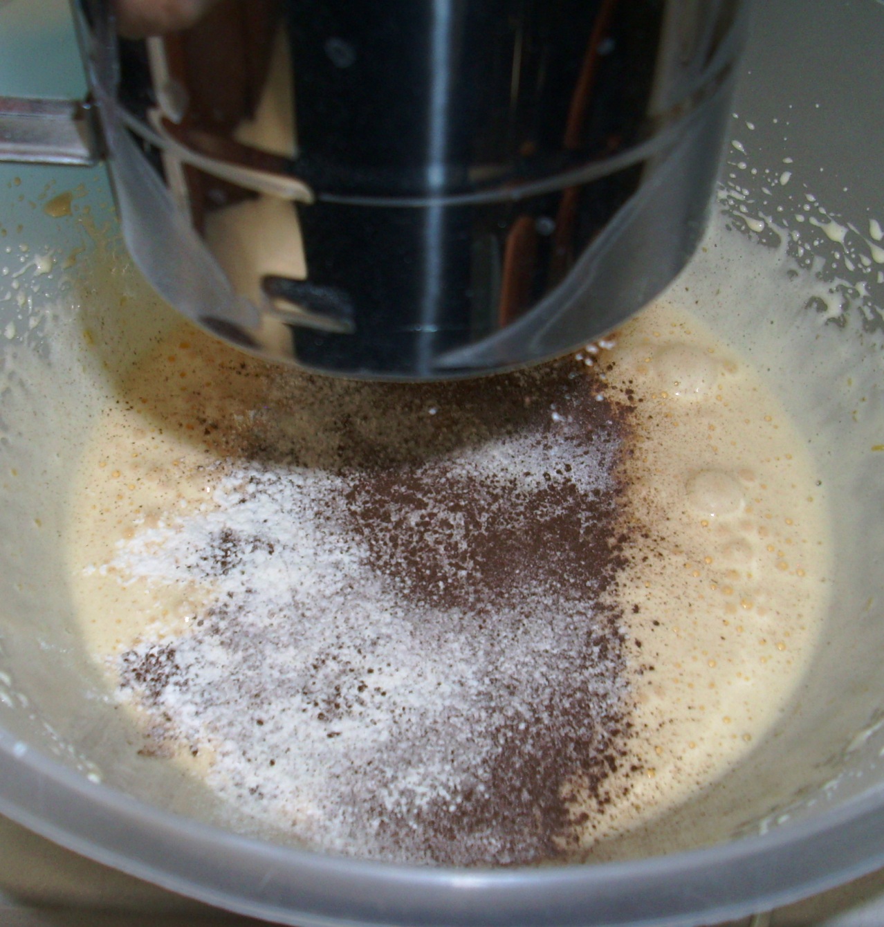 Добавить в яйцо, муку, какао и порошк для выпечки