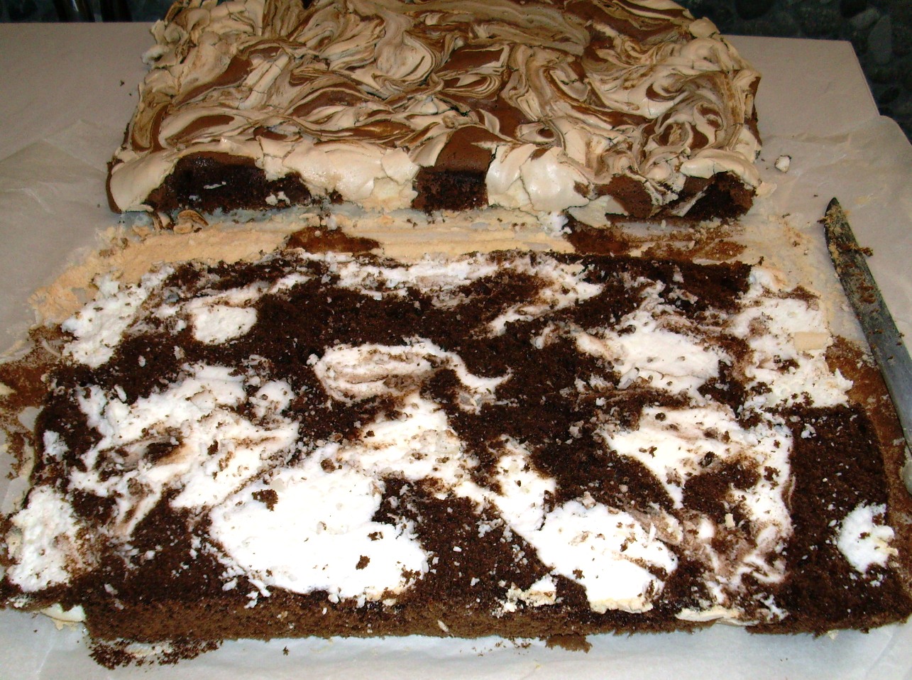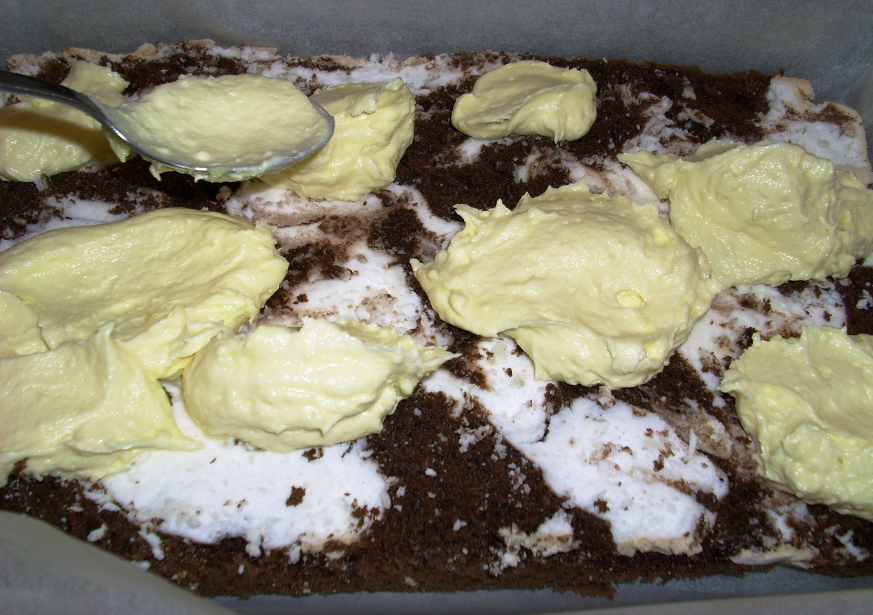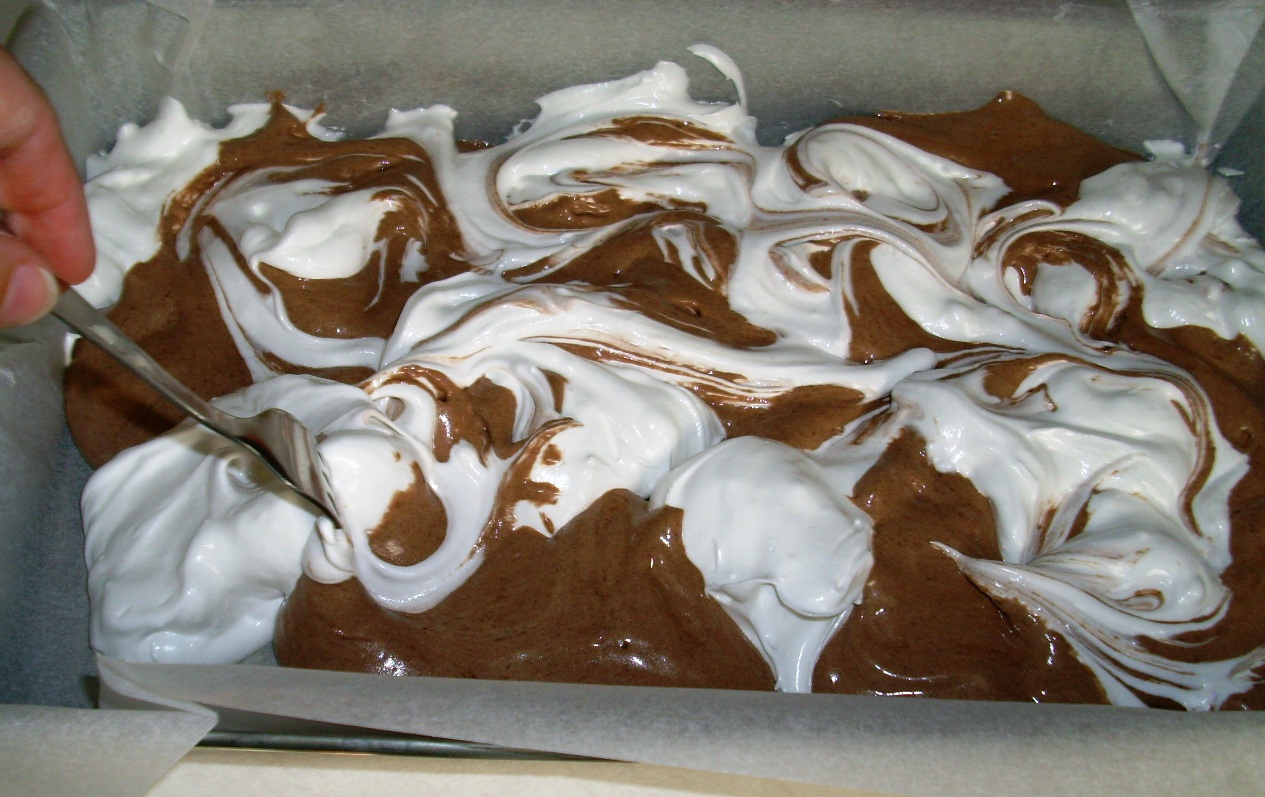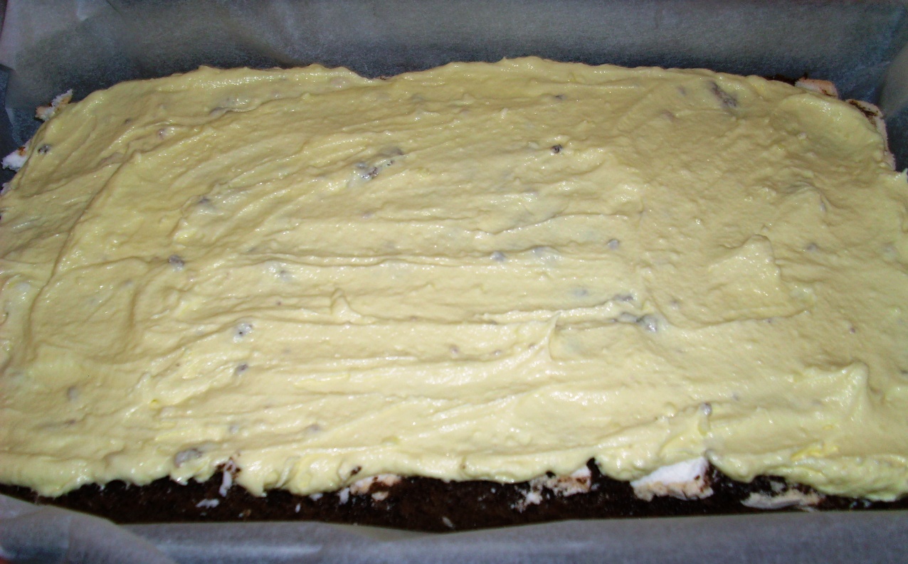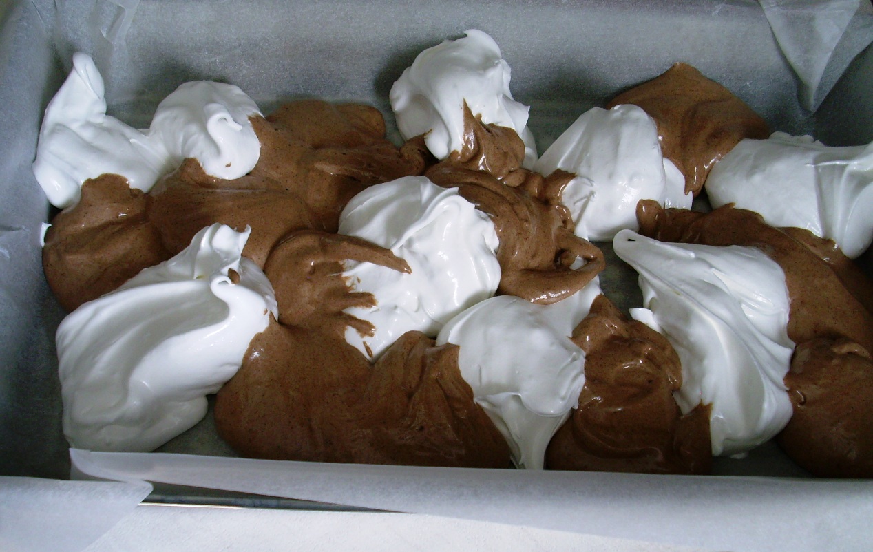 темное тесто: • 6 яичных желтка • 2 целых яйца • 6 столовых ложек сахара • 4 столовые ложки горкой муки • 2 чайные ложки какао- порошка • 1 чайная ложка выпечки