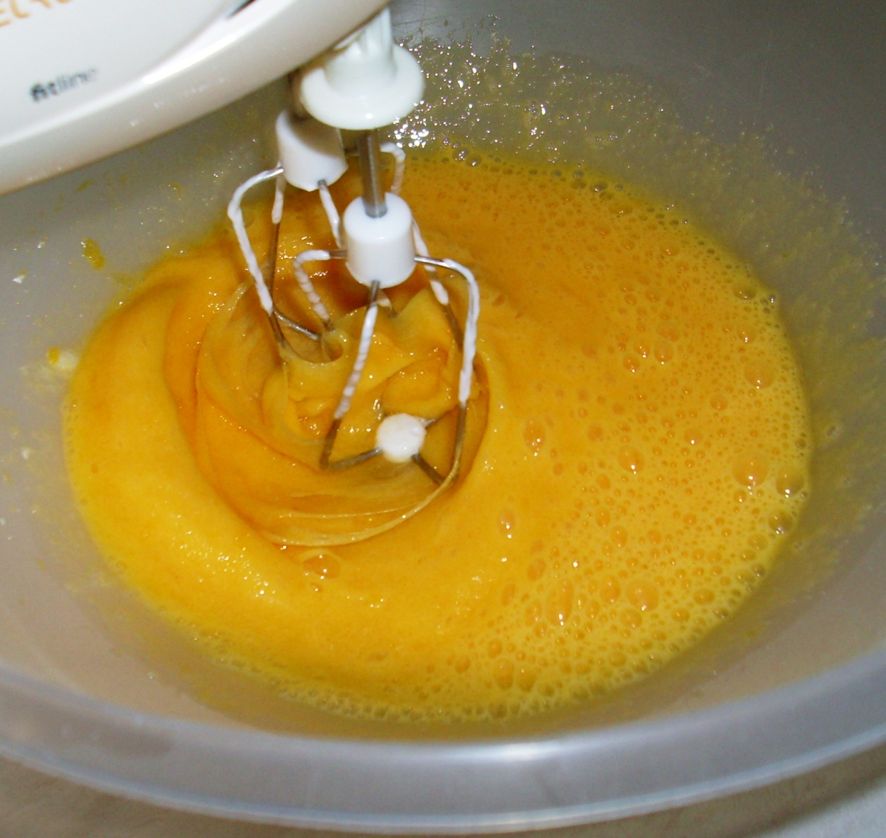Темное тесто: яичные желтки и целые яйца взбить с сахаром.