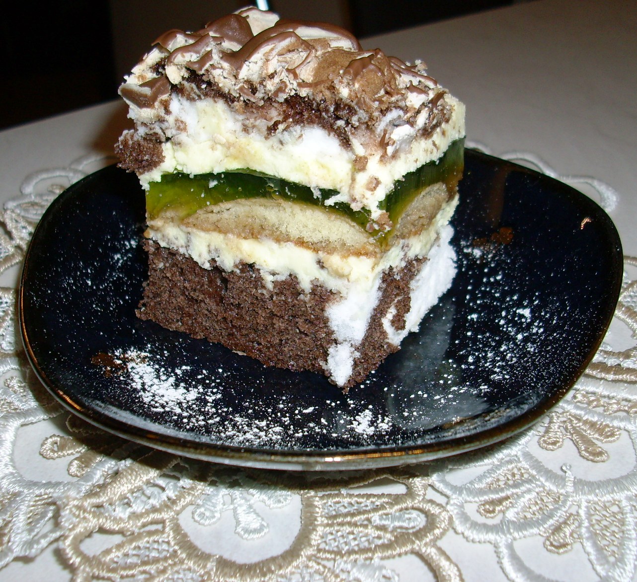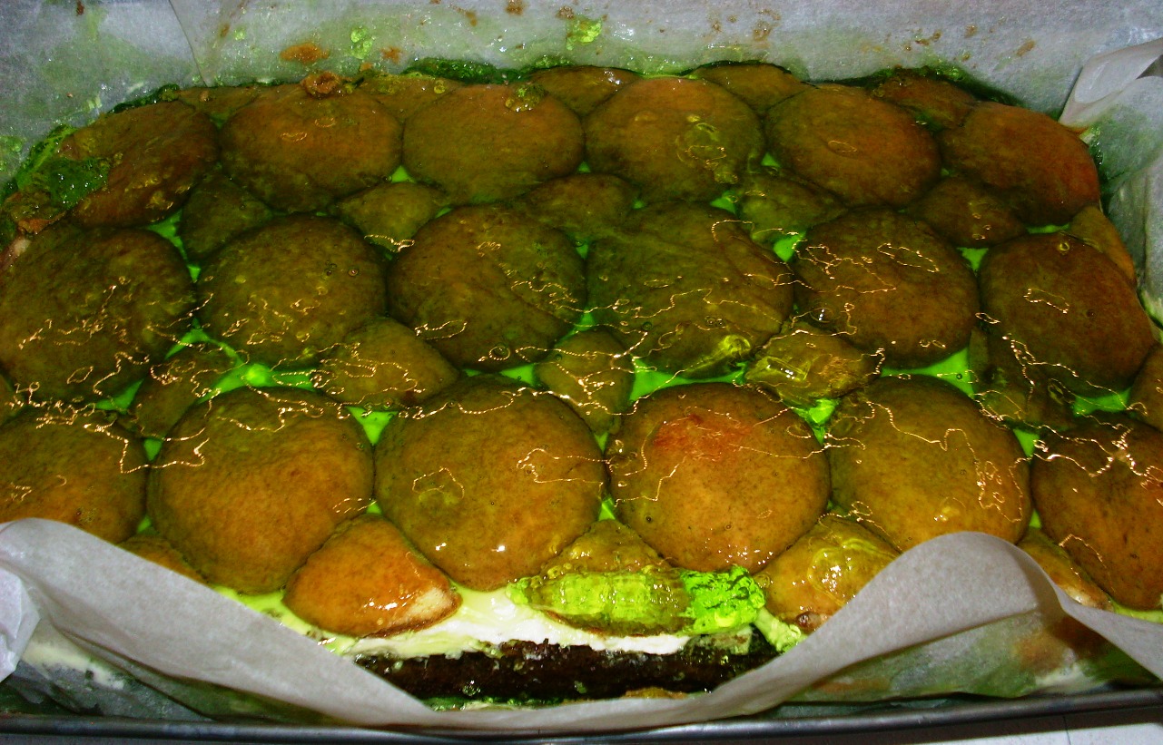 На печенье вылить желе.Поставить в холодильник на некоторое время, чтобы желе застыло. На олажденное желе положить остальной крем. Накрыть вторым коржом