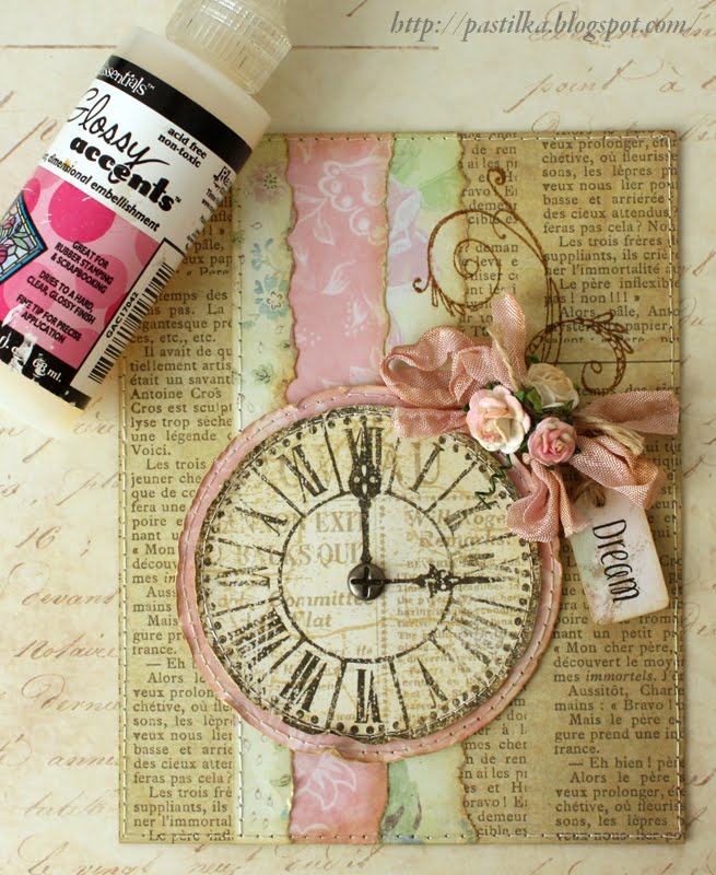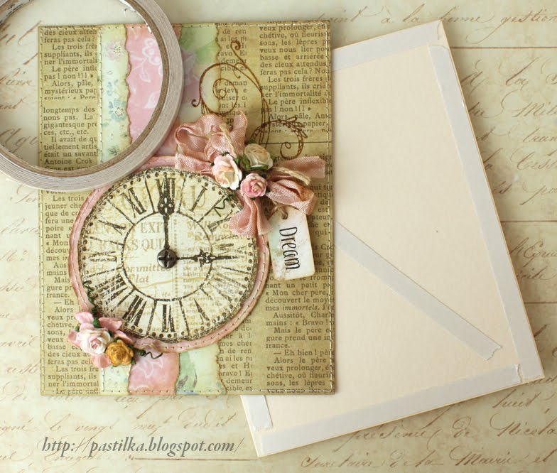 [показать]16. Темно-коричневыми чернилами ставим штампик завиток не доходя до циферблата. Лучше конечно сначала поставить штамп, а потом клеить часы, но не всегда точно знаешь, что будешь делать, даже если все уже придумано :)
