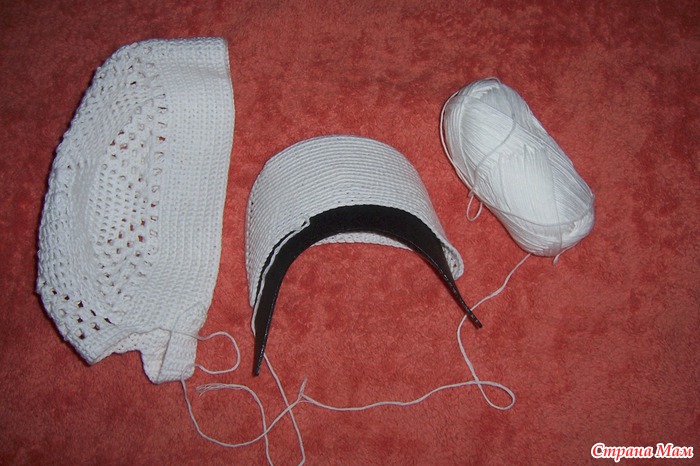 Затем чуток от второго. Козырек постоянно примеряла, один раз немного распустила, со второго получилось, после пришила этими же нитками. Не крахмалила, только постирала.
