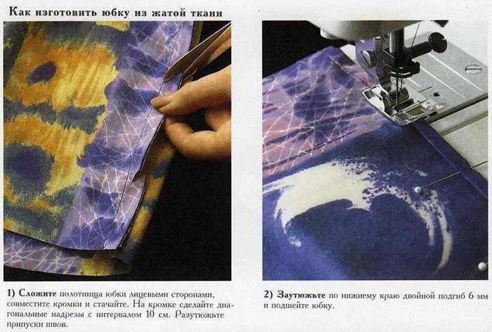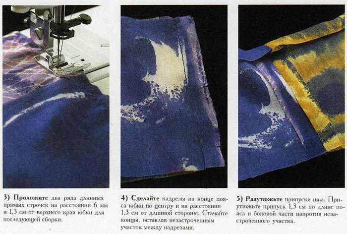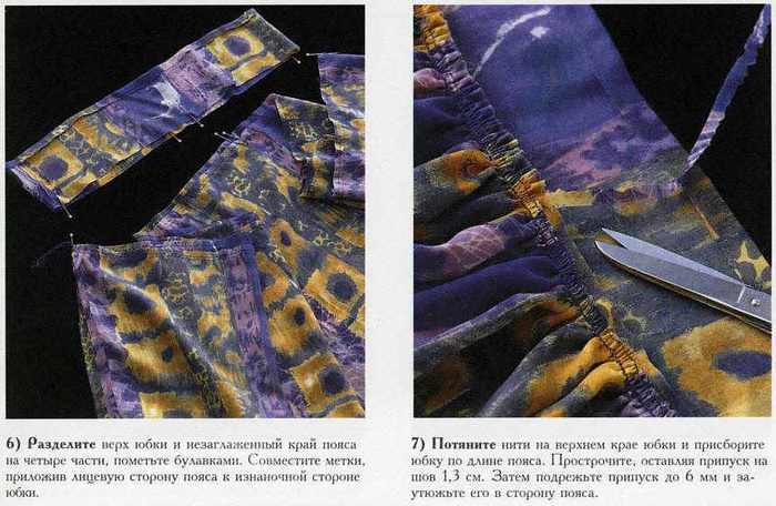 Жатая ткань уменьшается по длине и ширине. Выкраивая юбку, прибавьте 7,5 см к желаемой длине, с учетом усадки ткани. Не забудьте сделать необходимые припуски дна шов и подгибку ткани. На пошив юбки необходимо три или четыре длины. Если ткань прозрачная лучше взять четыре длины.. Что бы избежать утолщения по линии талии, нужно сделать эластичный притачной пояс.