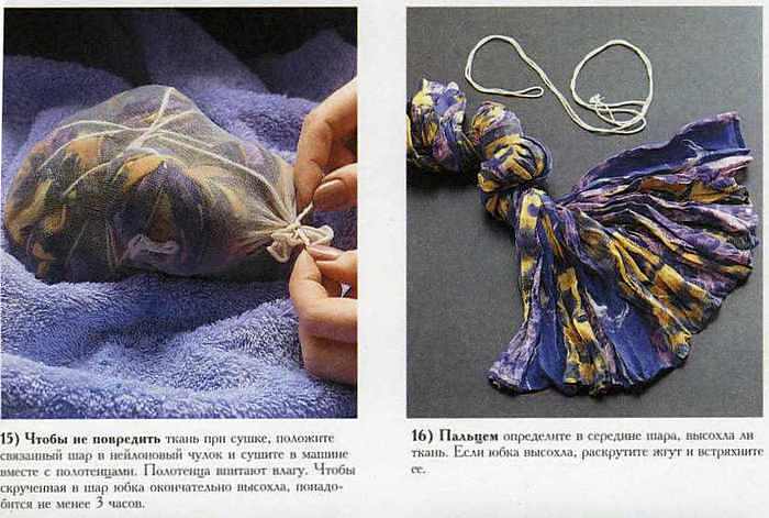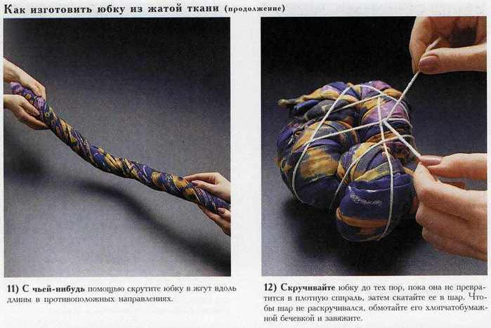 Юбку шьют до того, как ткань подвергнется специальной обработке. Сшитую юбку замачивают в прохладной воде, скручивают в плотный шар и помещают в микроволновую печь. Там под воздействием температуры закрепляются изломы на ткани. Что бы окончательно высушить юбку, ее , скрученную жгутом в виде шара, помещают в машинную сушилку.