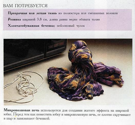Для создания эффекта жатой ткани на широкой юбке, понадобится микроволновая печь. Чтобы добиться наилучшего результата, возьмите легкую или тонкую ткань из полиэстра или смешанных волокон. Подойдет так же набивной креп-жоржет, шифон, батист или органза.