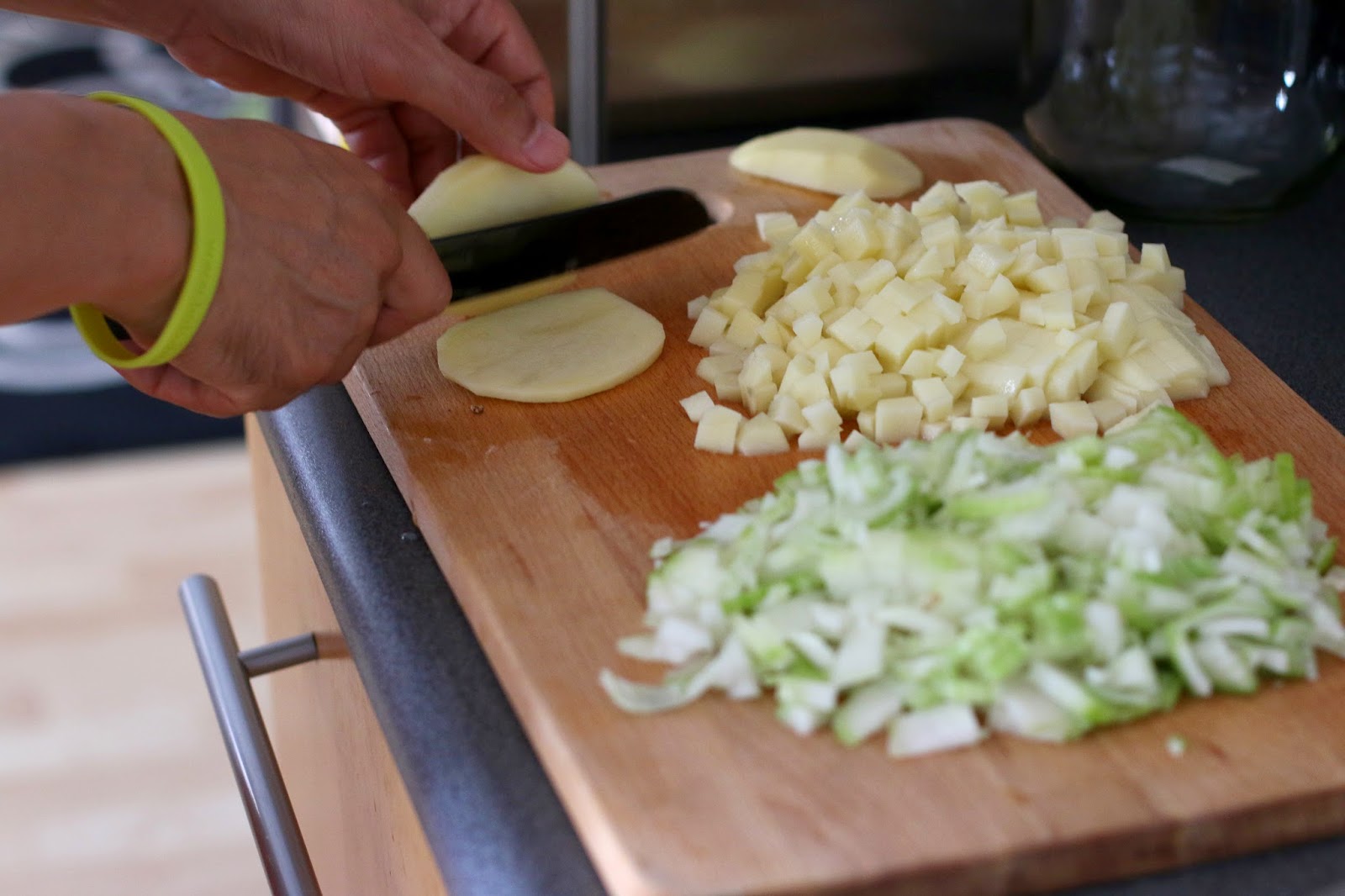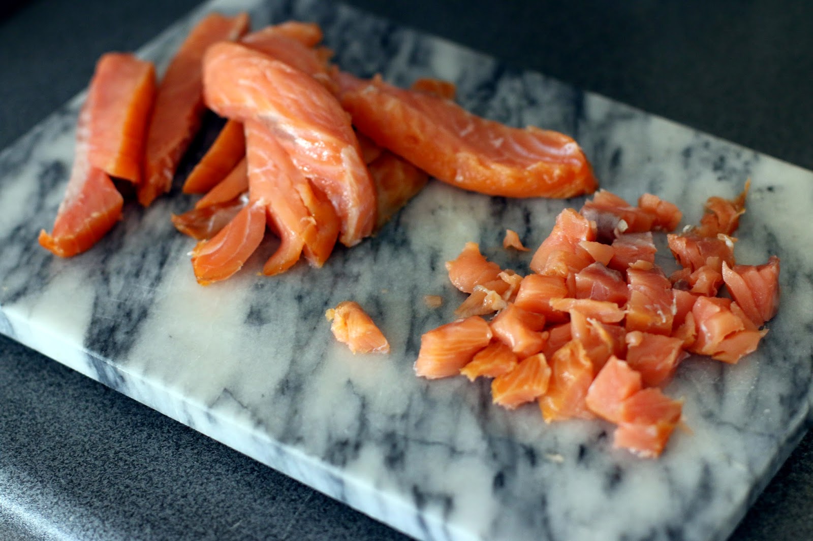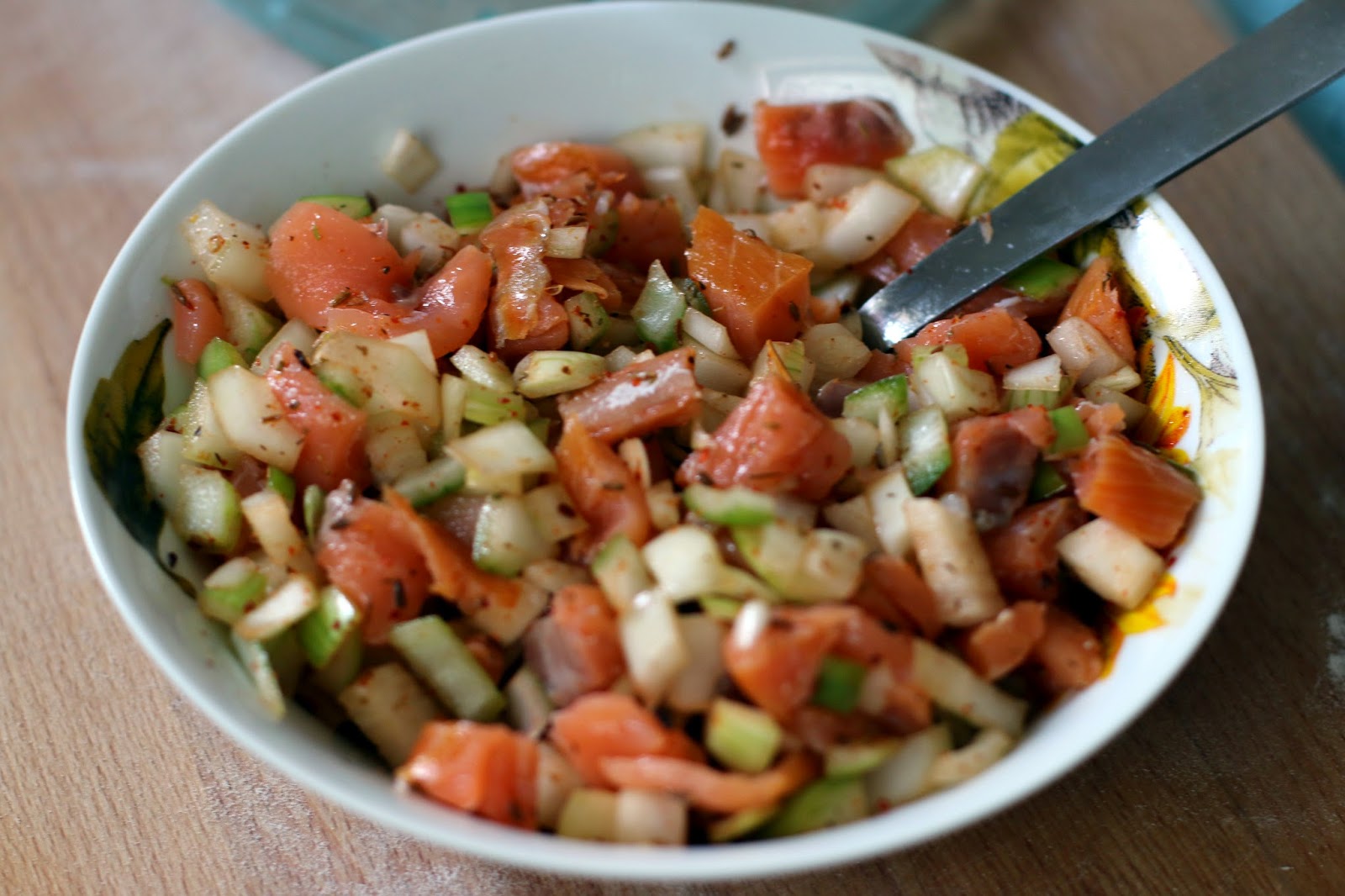 2) лосось + лук: лосось и лук нарезаем кубиками, заправляем приправами.