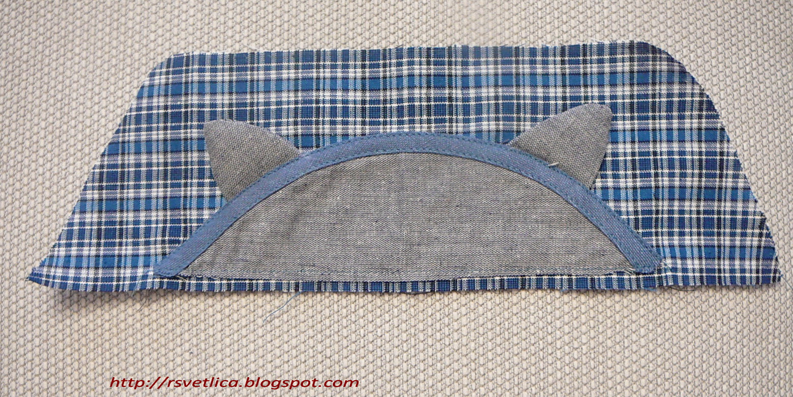 4. Ушки сшила, набила слегка синтепоном приколола к мордочке и все вместе пришила к другому боку пенала по краю косой бейки