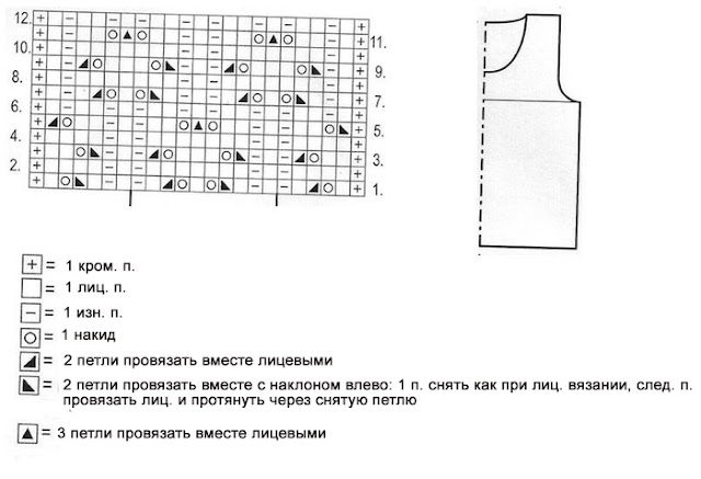 Описание вязания Размеры российские: 44-46 (48/50) 52/54 Спинка: набрать 92(102)112 п. и связать для планки 4 ряда резинкой 1х1. В последнем изн. р. прибавить 1 п.= 93(103)113 п. Далее вязать узором по схеме, распределяя петли следующим образом: 1 кр.п, 91(101)111 п. ажурным узором по схеме, 1 кр.п. Через 39 см = 84 р. от планки закрыть с обеих сторон для проймы последовательно в каждом втором ряду 5(6)7, 3 п. = 77 (85) 93 п. Через 54(55)57 см от планки = 116(118)122 р. закрыть для выреза горловины средние 25(27)31 и вязать далее раздельно, закрывая по краям выреза в каждом 2-м р. 1 х 5 и 1 х 2 п. На высоте 56(57)59 см от планки = 120(124)126 р. закрыть оставшиеся 19 (22) 24 п. каждого плеча. Перед: вязать, как спинку, но с более глубоким вырезом горловины. Для этого через 44 см = 94 р. от планки закрыть средние 15(17)21 п. и вязать далее раздельно, закрывая по краям выреза в каждом 2-м р. 1 х 4 и 3 х 2 п., 2 х 1 п. Оставшиеся петли плеч закрыть на высоте спинки. Сборка выполнить плечевые швы. На круговые спицы набрать по вырезу горловины приблизительно 100 п. и вязать резинкой 1х1 круговыми рядами на высоту 2 см. Выполнить боковые швы и обвязать пройму резинкой 1х1 на высоту 2 см (поднять 62 п.).