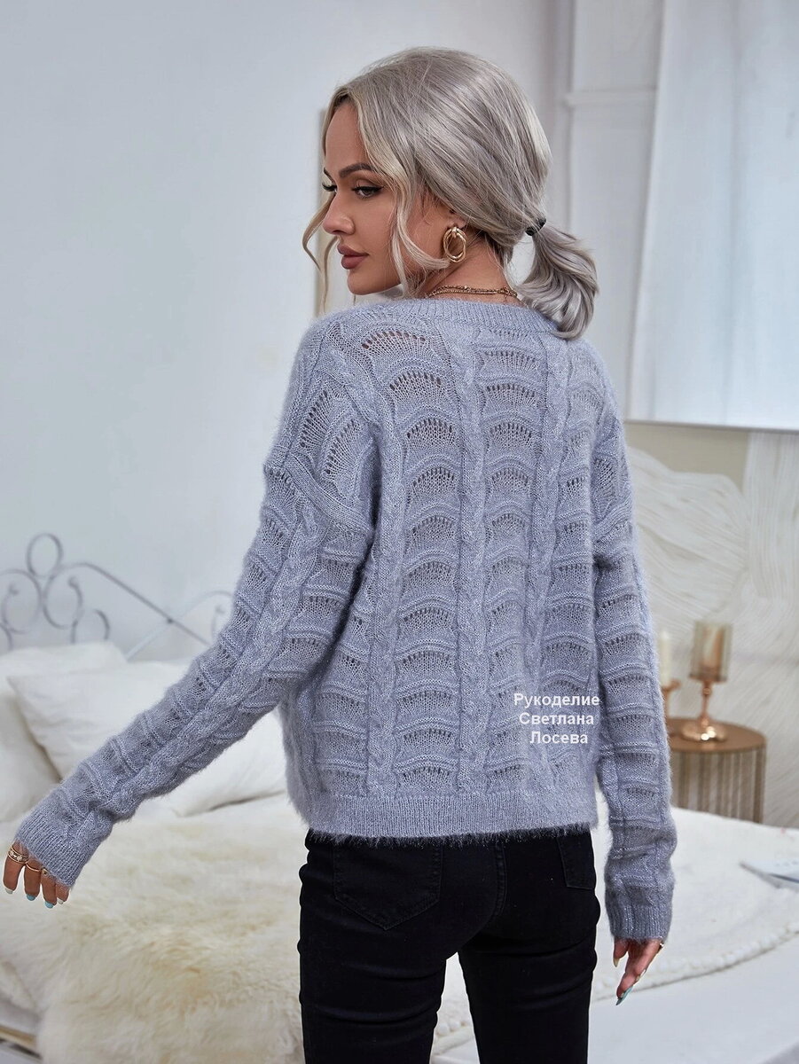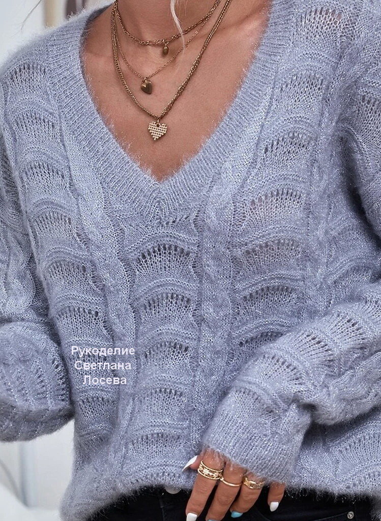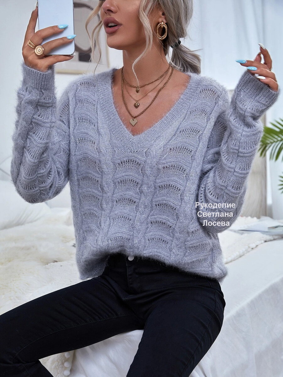 В целом пуловер производит очень приятное впечатление, включая цвет стильный серый. V-образный вырез будет хорош на большие размеры и визуально скрадывает пышные бедра. Вертикальные косы зрительно вытягивают силуэт и делают фигуру стройнее. Поэтому модель отлично подходит на размеры от 52 и выше.