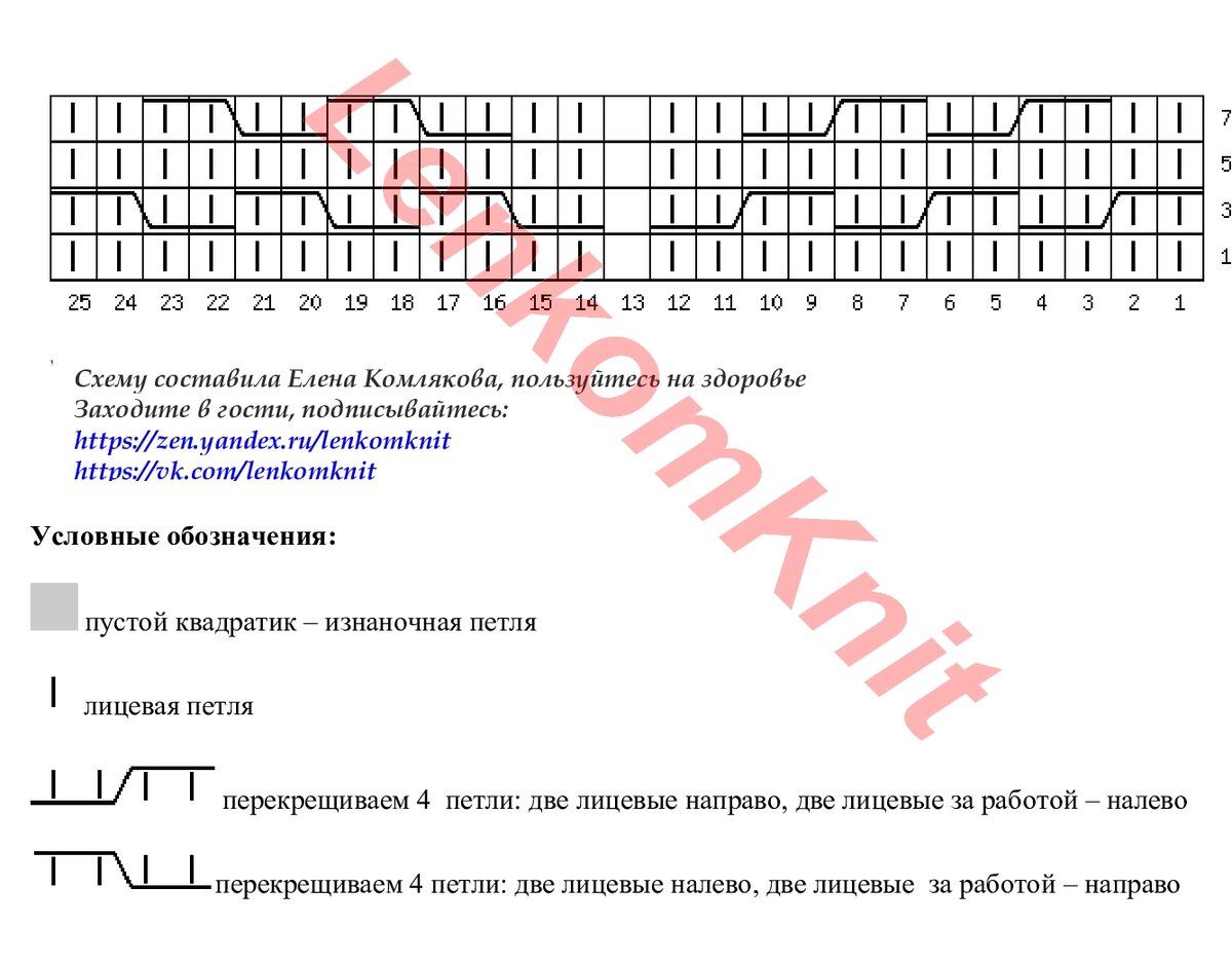 Схема центральной части водолазки (полный раппорт) - на рисунке. Справа и слева о центрального узора повторяются соответственно его правая и левая части. Между центральным и боковым узором - 8 изнаночных петель.