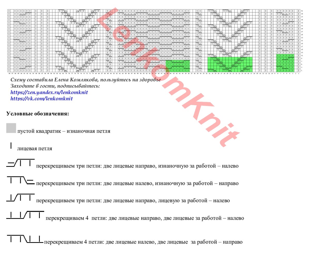 Схема узора и условные обозначения - на рисунке. В этой водолазке задействовано несколько узоров, раппорт каждого выделен на схеме зеленым цветом.