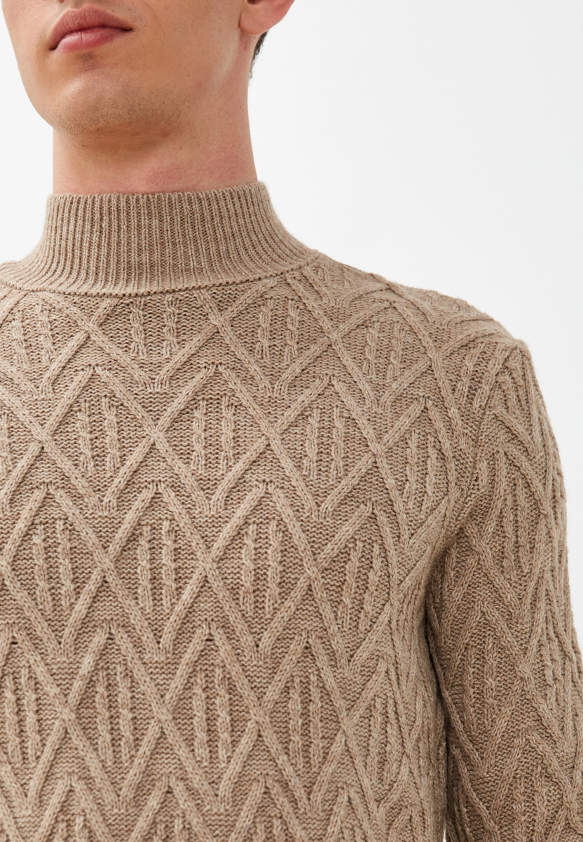 Вторая водолазка связана из 100% акрила интересным и неизбитым, но при этом ненавязчивым узором. У этой модели тоже прилегающий силуэт и втачной рукав, но ворот - не гольф, как у предыдущей модели, а высокая стойка (связана резинкой 1х1).