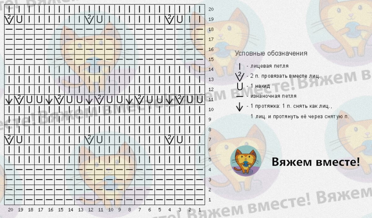 Узор чередует в себе горизонтальные дорожки изнаночных петель (4 ряда подряд) и участки с дырочками на фоне лицевой глади. На схеме дан один раппорт по высоте.