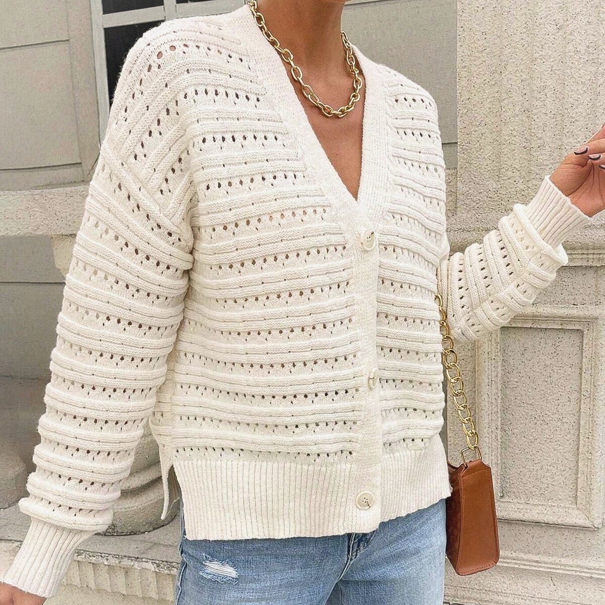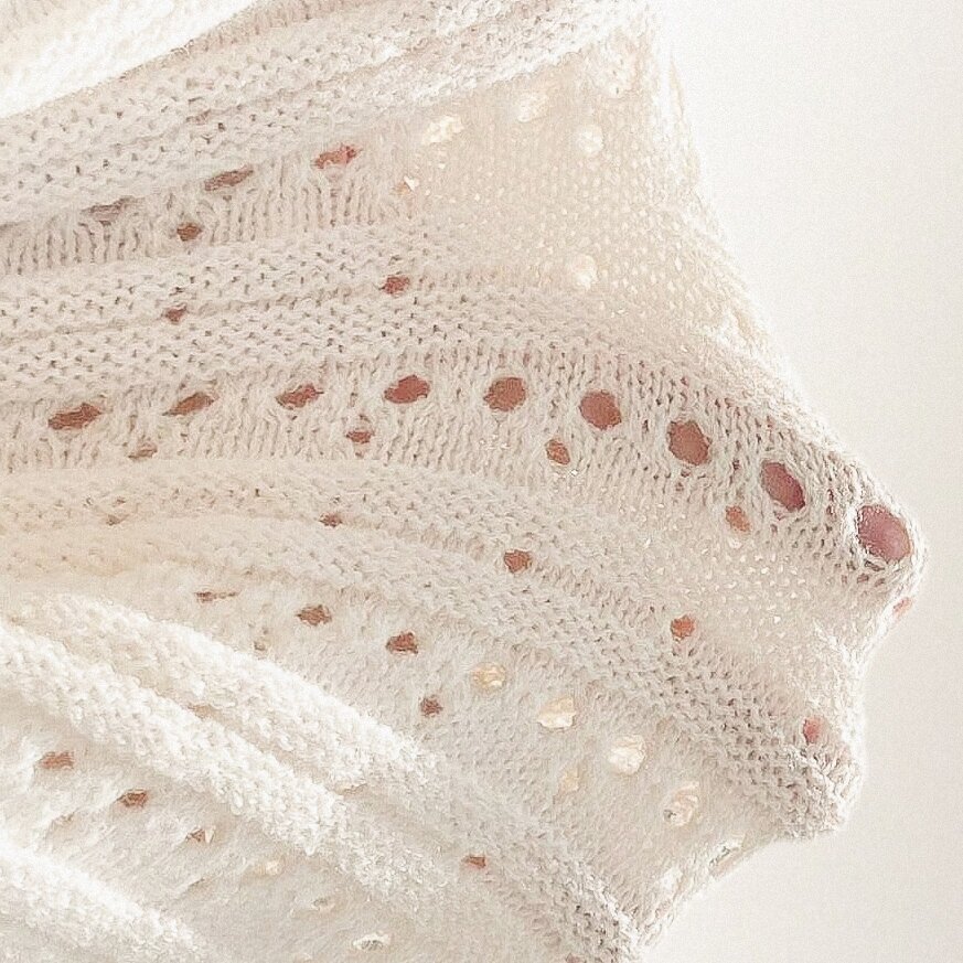 Белый кардиган, выполненный лаконичной комбинацией узоров в полотне, — здесь сочетаются горизонтальные полосы из изнаночных петель, разделённые дырочками на фоне лицевой глади.