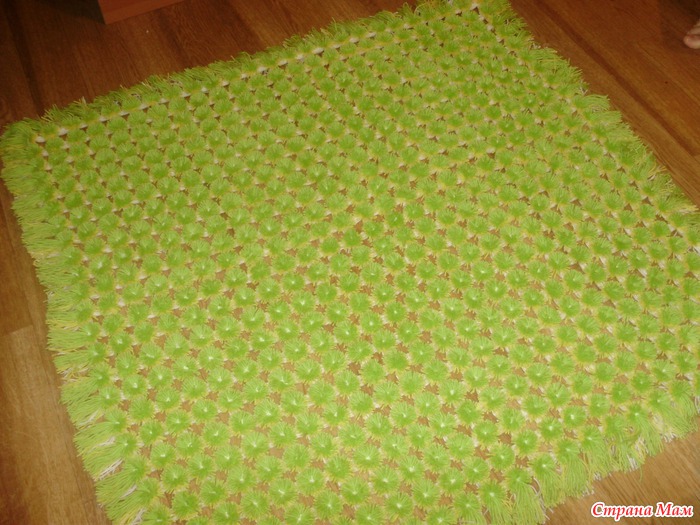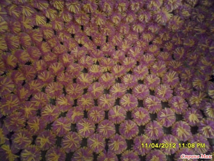 На плед размером 80*80 см уходит 1600м + 100м на перевязку скрещиваний . Для перевязки я использовала 25 см отрезки нитки х/б, т.к. при затягивании нитка рвалась.))))) Уже очень туго мы с мужем завязывали..