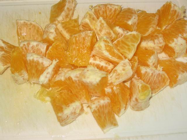 Сначала разберёмся с апельсином. Цедру натрём, сам апельсин очистим и порежем дольки кусочками.