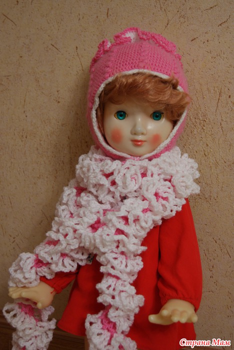 Далее я вставила шапочку одну в одну и обвязала обе шапочки сразу: 1 ряд - СТБН; 2 ряд - СТБН, 4 СТСН в одну петлю основания и так до конца ряда. Далее вязала завязки. Сначала отрезала 2 нитки белую и розовую длиной 1 м. (можно и больше). Сложила 2 нитки вместе, а потом вдвое. Петлю продела в шапочку