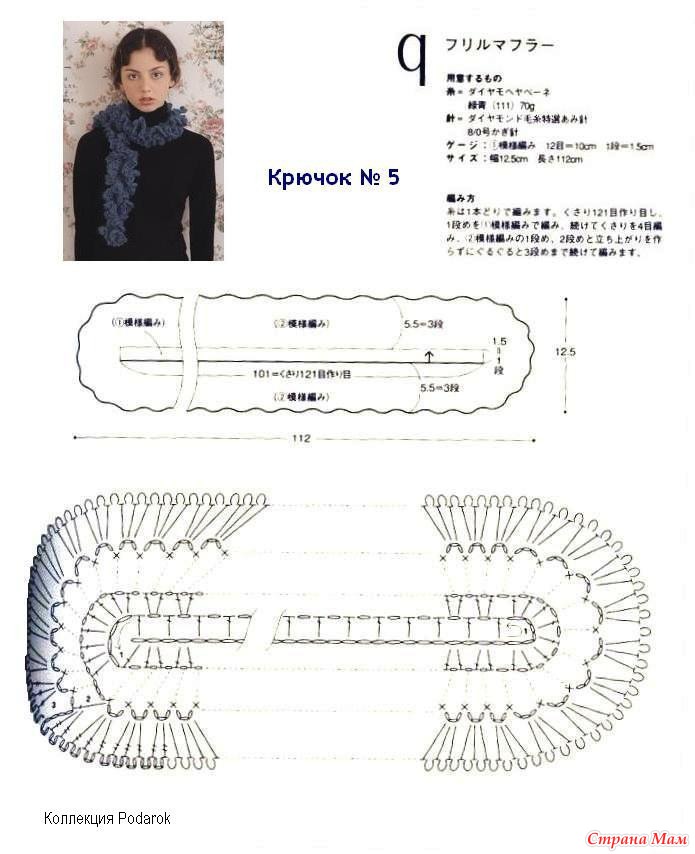 Дальше буду вязать шарф. Шарф нужно вязать свободно и толстым крючком № 5 (у меня такого нет, я вяжу № 4,5), чтобы он получился воздушным и не тяжелым. Набрать цепочку из возд. п. длиной 1 м. (учитывать количество петель нужно в зависимости от раппорта - количество петель должно быть кратно 2 петлям + 1 петля). Я набрала цепочку из 181 возд. п. + 6 возд. п. (это петли последнего столбика). Дальше первый ССН вяжется в 7 возд. п. с конца цепочки. Обратите внимание, что шарф вяжется по кругу без петель подъема! Петли подъема есть только в последнему ряду!