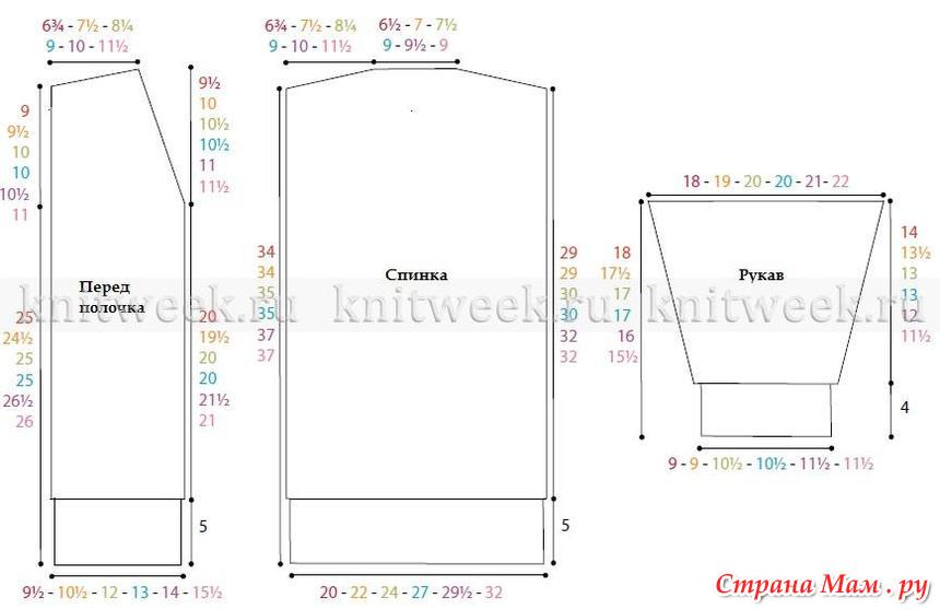 На спицы 4.5 мм набрать 46 (46-52-52-58-58) п. и выполнить 10 см резинкой как для спинки, в послед. изн. р. прибавить в центре 1 п. Перейти на спицы 5.5 мм и продолжить узором резинка. Через 2 ряда выполнить прибавления по 1 п. с каждой стороны из протяжки, повторять ряд прибавлений в каждом 4-4-2-2-2-2 ряду пока на спицах будет 91 (95-101-101-105-109) п., новые петли вязать резинкой. Через 45.5 (44.5-43-43-40.5-39.5) см закрыть все петли.