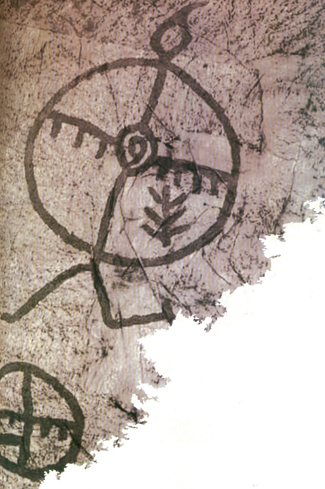 Возможно, показано прохождение звезды рядом с Солнцем. Звезда изображена в виде маленьких кружков. Извилистые линии - это газопылевые облака, которые остались после небесной "битвы" между звездой и нашим светилом. Хакасский национальный музей им. Кызласова.