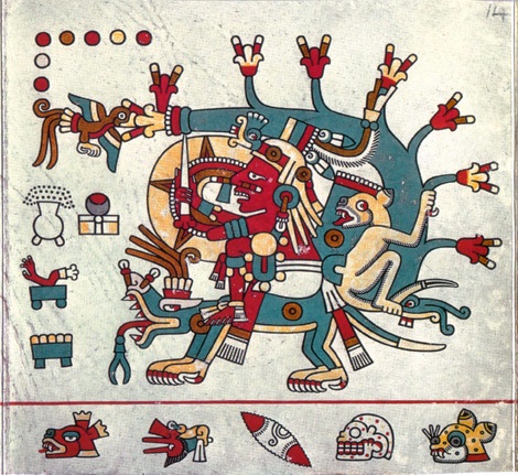 В кодексе Лауд имеется иллюстрация, где изображена гибель человечества во время этого катаклизма. На фрагменте из древнего кодекса показан ацтекский Тифон и его 11 спутников, в виде красных точек в черном круге, которые расположены на спине и голове чудовища. На рисунке скелетообразный монстр, с руками и ногами состоящих из костей, заглатывает бедного индейца. Череп, и кости – символы смерти у ацтеков.