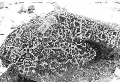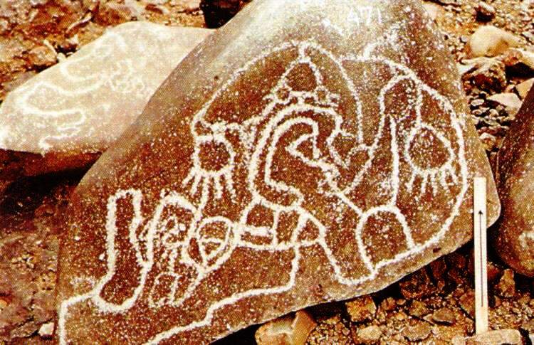 Рис. № 7. Петроглиф. Чили. Звезда - круг с отходящими от него лучами. Объекты изображенные в виде извилистых линий - газовые облака, которые со временем рассосались в космическом пространстве.