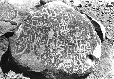 Рис. № 1 Петроглиф. Чили. Индейцы изображали этот небесный объект в виде круга с точкой и с одним или двумя отходящими от него лучами, Дракона, а также креста в круге.