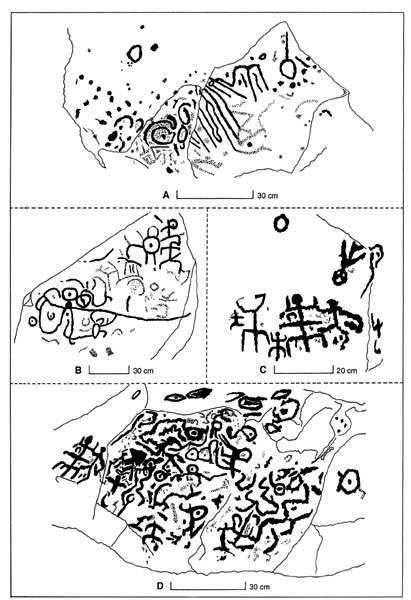 Рис. № 8. В горах Чили имеется сотни рисунков изображающих катаклизм произошедший в далеком прошлом при появлении звезды рядом с Солнцем. Петроглифы находятся в самых различных местах территории страны. Это говорит о том, что рисунки на скалах рисовал не один человек. Они очень похожи друг на друга. Индейцы изображали то, что они видели в небе. Прорисовка петроглифов сделана Хансом Нимейером.